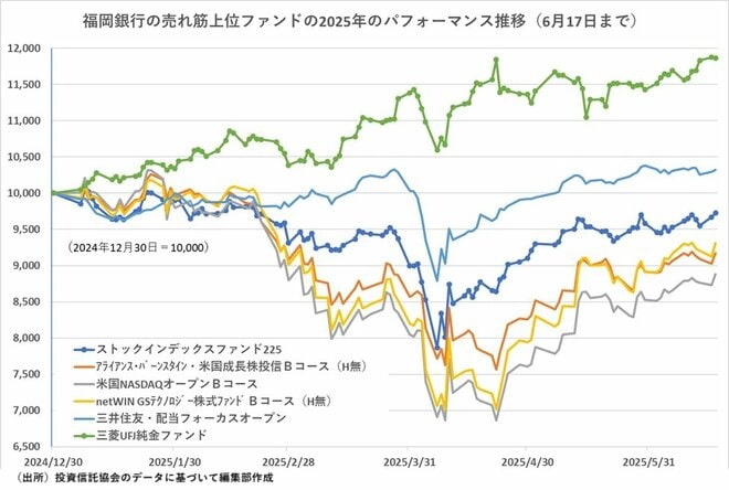 福岡銀行の売れ筋上位では、「ストックインデックスファンド225」の評価ダウンが目立った。トップ10上位に入ったファンドの2025年のパフォーマンスをみると、ランキングを一気に上げた「三菱UFJ純金ファンド」が別格の強さを見せて入っているほかは、4月上旬の急落を経て、その戻り過程にあるのが現在の水準だ。「三菱UFJ純金ファンド」以外は、株式を投資対象としたファンドで、米国株式主体のファンドが3本、日本株式主体のファンドが2本という内訳になっている。