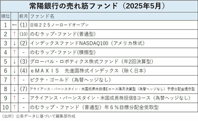常陽銀行の投信売れ筋ランキング(販売件数)の2025年5月のトップは前月と同じ「日経225ノーロードオープン」だった。第2位に前月第10位の「のむラップ・ファンド(普通型)」がジャンプアップし、前月第2位だった「インデックスファンドNASDAQ100(アメリカ株式)」は第3位に後退した。また、「のむラップ・ファンド(積極型)」がトップ10圏外から第4位に食い込むなど、バランス型の「のむラップ・ファンド」が大きく順位を上げたことが目立った。同じく、トップ10圏外から「ピクテ・ゴールド(為替ヘッジなし)」が第7位にランクインするなど、株式ファンドの順位が後退し、バランス型や株式以外の資産に投資するファンドの順位が上がった。