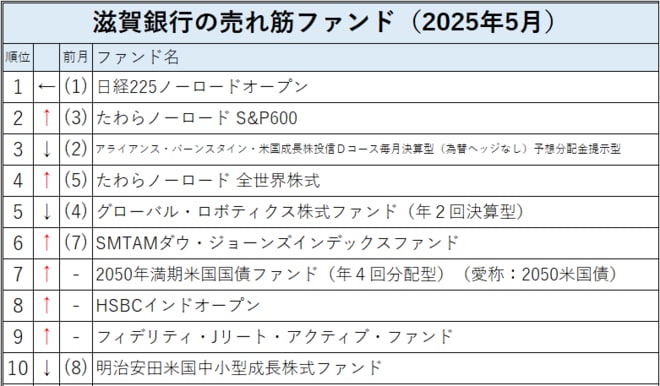 滋賀銀行の投信売れ筋ランキング(販売件数)の2025年5月のトップは前月と同様に「日経225ノーロードオープン」だった。第2位は前月の第3位から「たわらノーロード S&P500」が浮上し、前月第2位だった「アライアンス・バーンスタイン・米国成長株投信Dコース毎月決算型(為替ヘッジなし)予想分配金提示型」は第3位に後退した。また、第4位には前月第5位から「たわらノーロード 全世界株式」が、第6位には前月第7位から「SMTAMダウ・ジョーンズインデックスファンド」が浮上するなど、主要な外国株式インデックスファンドが順位を上げた。一方、トップ10圏外から「2050年満期米国国債ファンド(年4回分配型)(愛称:2050米国債)」が第7位に、「HSBCインドオープン」が第8位に、「フィデリティ・Jリート・アクティブ・ファンド」が第9位にランクインした。