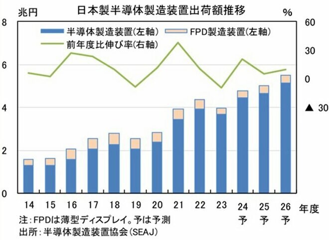 神様:日本の市場予測も見てみましょう。日本半導体製造装置協会によれば、2025年度の日本製製造装置の出荷額について、前年度比で4.9%増となる5兆41億円と予測しています。半導体市場が拡大するとともに、日本製の半導体製造装置の出荷も2026年度まで右肩上がりで伸びていく予想です。生成AIを中心としたAI関連半導体の開発投資が半導体の需要拡大をけん引しています。GPUやハイエンドメモリなどのAI向け半導体の高性能化が半導体メーカーの開発投資を促し、製造装置や半導体材料の出荷増加につながっています。