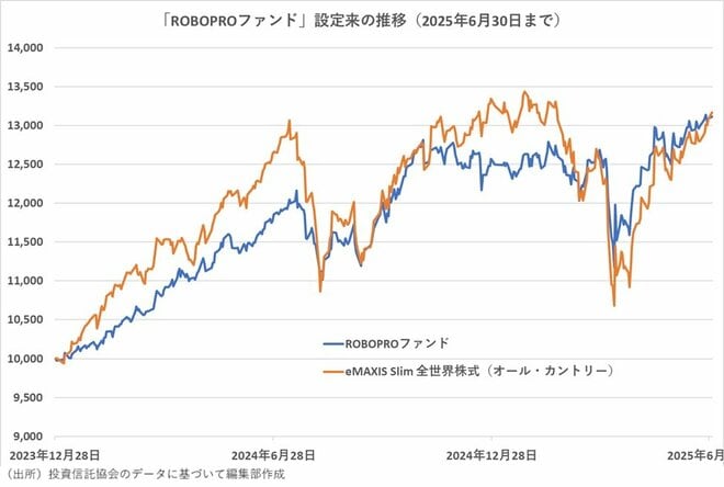 株式ファンドは、2024年7月、そして、2025年4月と過去1年半の間に2回の大きな下落局面を経験している。2024年7月は、11月の米大統領選挙に向けてバイデン政権が対中半導体規制の厳格化を検討しているという報道があり、対中強硬路線を明確にしたトランプ氏のインタビューなどが取り上げられて政策リスクへの警戒が急速に高まり、世界的に半導体関連株が大幅下落した影響。2025年4月は「トランプ関税」による影響だった。6月末時点というのが、その株価の急落から株価の水準が戻った直後というタイミングであるため、「ROBOPROファンド」の成績が良く見えるタイミングということはいえるのかもしれない。また、分散投資することによって安定的な値動きで株式の大きな下落率を抑制し、株式と変わらないようなリターンが得られる運用も可能だということを同ファンドは証明してみせたともいえる。