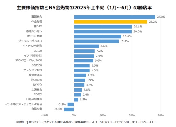 今年前半の主要国株価指数の騰落率をまとめてみた。ニューヨーク金先物価格も含めて比べてみたい。過去最高値を更新したNY金先物を上回ってトップだったのは、意外にも韓国総合指数(KOSPI)で、上昇率は28%にもなった。大統領選に当選した李在明(イ・ジェミョン)氏が株式市場活の活性化に積極的な姿勢をみせたことに加え、韓国銀行(中央銀行)が5月末に利下げに動いたことも、韓国の株式相場を後押しした。