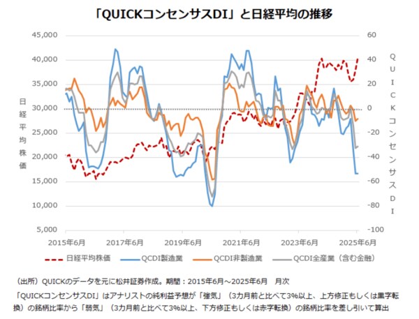 実際、個別の日本企業の先行きは市場でどのように捉えられているか。アナリスト予想の上方修正と下方修正の社数から算出する「QUICKコンセンサスDI」(リビジョンインデックス)は、製造業、非製造業、全産業(含む金融)すべてにおいてマイナスだ。つまり、市場全体の日本企業に対する期待値は総じて下向きであることが分かる。