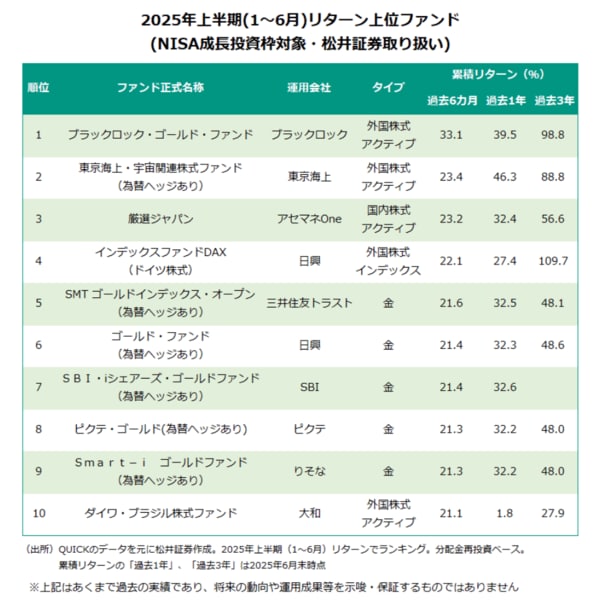 個別ファンドの運用成績をみてみよう。やはり、強さを見せているのがゴールド関連だ。このほか中小型株への投資比率が高い国内株のアクティブファンドも上位に顔を出した。トランプ関税の影響が比較的小さい銘柄を保有していたことが奏功したとみられる。
