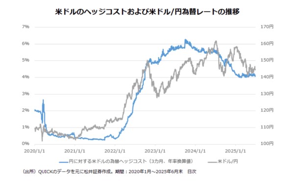 今でも、日米のヘッジコストは約4%。為替変動リスクを抑えるための「保険料」として妥当なのかといえば、判断に迷うところではある。ただ、今年前半は8%以上円高に振れたため、結果的に為替ヘッジした方が高いリターンを享受できた。また、トランプ大統領は次期FRB議長について、利下げに積極的な「ハト派」の人物を指名する可能性が強い。FRBの利下げは日米のヘッジコストを低くするだろうし、さらなるドル安の要因にもなるだろう。