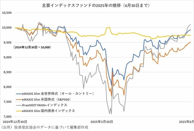 「コメ」の価格をはじめ日常生活においてインフレ(物価上昇)が進んでいることは利上げの材料の1つになる。さらに、国内の参議院選挙で与党も含め、各党が訴える政策が減税や給付金など財政拡張政策ばかりとなっており、先進国で最悪の政府債務残高を一段と悪化させる内容であることも国内債券市場にとってはマイナス材料だ。株式との分散投資効果はあるものの、当面は価格下落のリスクが想定される資産であるのなら、積極的に購入することは難しいと考えられるが、投資家の判断はどうだろうか。実際に、2025年の主要インデックスファンドの推移をみると、株式インデックスファンドは4月に急落したとはいえ、6月末時点では「eMAXIS Slim 全世界株式(オール・カントリー)」や「iFreeNEXT FANG+インデックス」は、「eMAXIS Slim 国内債券インデックス」を超える基準価額の水準になっている。