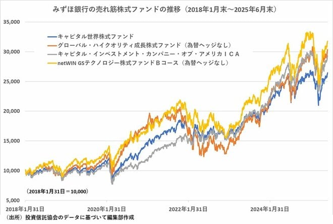 みずほ銀行の売れ筋の株式ファンドのパフォーマンスを振り返ると、「キャピタル世界株式ファンド」を挟んで、「netWIN GSテクノロジー株式ファンドBコース(為替ヘッジなし)」と「グローバル・ハイクオリティ成長株式ファンド(為替ヘッジなし)(愛称:未来の世界)」の2ファンドのパフォーマンスが強く、「キャピタル・インベストメント・カンパニー・オブ・アメリカ ICA」が劣後するという状況が2018年1月から2021年末くらいまで続いた。