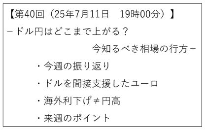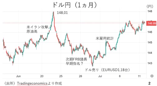 まず、過去1ヶ月のドル円相場を振り返ります(2ページ)。中東での地政学リスクの高まりを受けて原油価格の上昇とともにドル高が進み、一時148円台に載せました。ただその後はアメリカの利下げ観測の台頭とともにドル売り地合いとなりました。トランプ大統領が次期FRB議長を早期に指名すると表明した後、ユーロドルが4年ぶり高値となる1.18台まで上昇し、その場面でドル円も143円台を割り込みました。ただ、ドル安の決定打を欠く中、持ち堪えたドル円は6月分の雇用統計を受けて7月の利下げ観測が後退したことから反発しました。もっとも、トランプ大統領が相互関税の税率に関する書簡を12の国や地域に発送すると表明したことからややドルが下落して今週を迎えました。そして今週のドル円は147円台まで上昇しました。