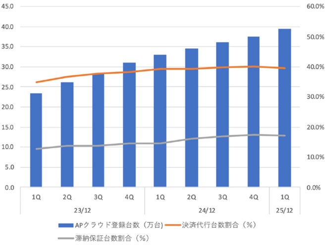このビジネスモデルの有効性は主要なKPIの伸長にも明確に表れている。APクラウド登録台数は2025年3月末時点で39.4万台(前年同期比20%増)に達し、それに伴い直接的な売上源となる決済代行台数や滞納保証台数もそれぞれ20%増、41%増と順調に拡大している。
