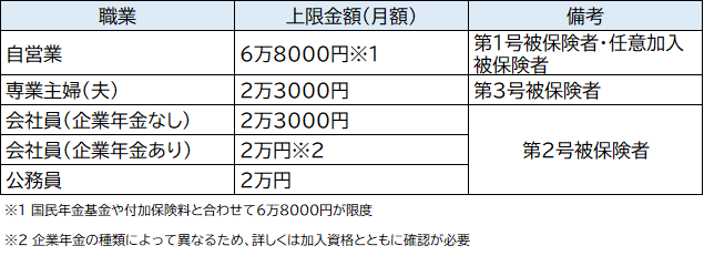 上限額については、職業や勤め先で導入している企業年金制度によって異なる。例えば企業型DC(確定拠出年金)がない会社員・公務員は月額2万3,000円、自営業者等(第1号被保険者)は月額6万8,000円などの上限がある。自分の状況に合わせた上限額を確認することが重要だ。