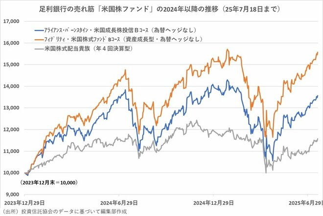 足利銀行の売れ筋トップ10には米国株式ファンドが3本ランクインしていることが特徴の1つだ。それぞれに違う運用を行っているため、そのパフォーマンスは同じように米国株式を投資対象としていても特徴のある推移をみせている。