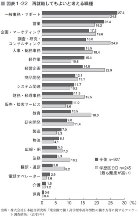 一般的にハローワークやシニアコーナーで求人が多いのは、警備、マンションの管理人、ビル清掃といった仕事となっています。一方、日本総合研究所の調査20によれば、ミドル・シニア男性の希望する再就職の仕事は、「一般事務・サポート」が最も多くなっています。特に学歴が高いミドル・シニア男性においては、「調査・研究・コンサルティング」「経営企画」「(人材)教育」を希望する人も少なくありません(図表1―22)。職種の面でミスマッチが生じているという問題は今に始まった話ではありませんが、高学歴のミドル・シニア男性ほど、ミスマッチが生じやすいのが現状といえます。