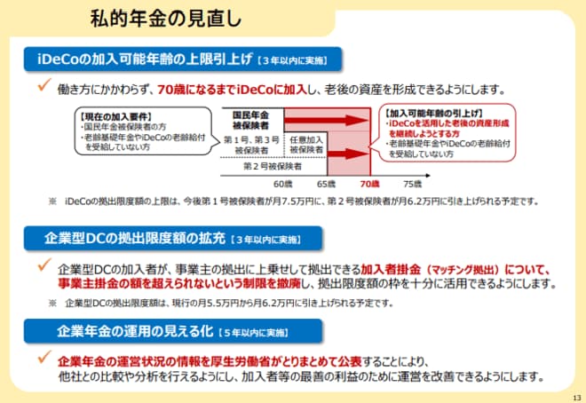 2025年6月13日、年金制度改革関連法案の修正案が参院で可決・成立した。「社会経済の変化を踏まえた年金制度の機能強化を図る」ため、iDeCoについても掛金上限額等が変更される。