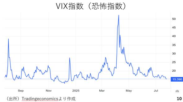 米国ではS&P500指数やナスダック指数が史上最高値を更新しており、日本でもTOPIXが最高値を更新しました。欧州でもいくつかの株価指数が最高値を更新しており、市場はリスク選好に書傾斜しています。実際、VIX指数も15台まで低下してきました。円はリスク回避局面で買われやすいと連想されるだけに、こうしたリスク選好の環境ではむしろ売られやすい状況と言えます(10ページ)。
