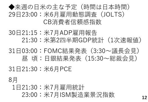 それでは来週の日米の主な予定を確認しておきます。週末の雇用統計を含め、米国では労働関連の指標が目白押しです。また、31日に日付が変わった午前3時にFOMCの結果が発表され、同じ日の昼頃に日銀の金融政策決定会合の結果も発表される予定です(12ページ)。