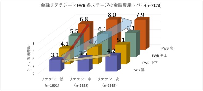次に、図表5では図表4の金融リテラシーとFWBのマトリックス上に、人数分布の代わりに保有金融資産の平均階級※4をプロットしました。金融リテラシーを軸にしてFWBの変化に伴う金融資産レベルの動きをみると、たとえば金融リテラシー低では、FWBが低位から3.1→4.1→5.5→6.8と保有資産階級が大きく上昇します(左赤矢印)。金融リテラシー中、高でも同様です。この関係は図表3で確認した関係(保有資産レベルに比例してFWBスコアが上昇)と同様の関係性を示しています。
