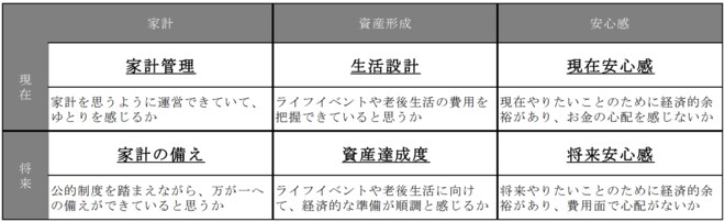 ※2 MUFG資産形成研究所ではFWBの定義に基づき、FWBを構成する要素を下表のとおり整理している。家計・資産形成・安心感の3つの軸について、現在時点、将来にむけての2つの次元で捉え、6つの要素とした。FWBスコアは6要素それぞれの状態を問うアンケート(各2~3問)結果から100点満点として算出したもの。(詳細は※1 ③のレポート参照)