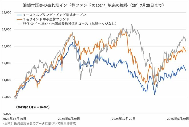 浜銀TT証券の売れ筋に入っているインド株ファンドがジリジリと順位を下げている。この背景にあるのは、インド株ファンドのパフォーマンスが今一つ冴えないことが考えられる。2023年12月末を起点として2024年1月以降の基準価額(分配金込み)の推移を振り返ると、インドの代表的な銘柄に投資して中長期的に投資収益の最大化をめざす「イーストスプリング・インド株式オープン」は、継続して「アライアンス・バーンスタイン・米国成長株投信」を下回る運用成績になっている。2024年1月以降の世界の株式市場では、2024年8月と2025年4月に急落し、その後に株価が戻るという経緯をたどっているが、この2回の株価急落からの戻り局面で、インド株の戻りは米国株の戻りに届いていない。