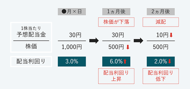 さらに、高配当株の値動きに対する誤解にも注意が必要です。一般的に、配当利回りが高くなってくると、配当狙いの買いが入って株価が下がりにくくなる(下値抵抗力がある)ため、高配当株にはそうした買いが入りやすいと言われています。確かにそういった一面もありますが、決して「高配当株の株価は下がらない」という意味ではありません。