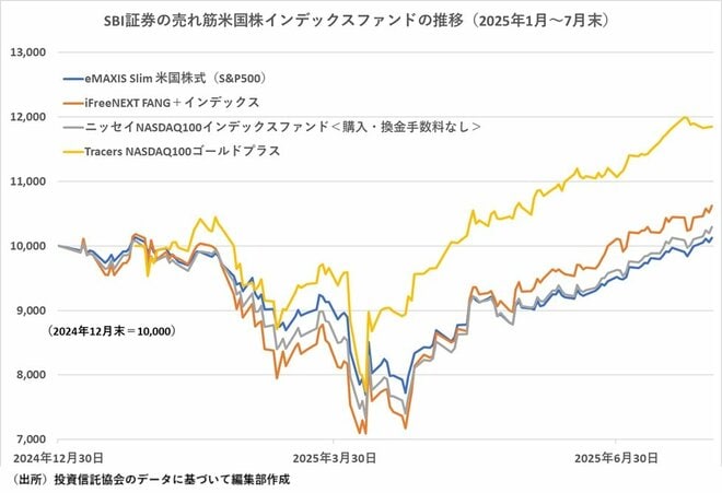各ファンドの基準価額の動きを振り返ると、4月の急落時において「ニッセイNASDAQ100インデックスファンド」は「eMAXIS Slim 米国株式(S&P500)」よりも大きな下落率となったことから、その後の上昇率は大きかったもののファンドの基準価額の推移としては7月時点では「eMAXIS Slim 米国株式(S&P500)」とほぼ同等の水準にあった。さらに「NASDAQ100」と比較すると、ランキングで4位の「iFreeNEXT FANG+インデックス」は4月の下落率は最も大きかったものの、その後の戻りにおいても明確に「eMAXIS Slim 米国株式(S&P500)」を上回るパフォーマンスを見せている。2025年になっても米国株市場の主役は「半導体」であり「AI」であることを感じさせる動きになっている。
