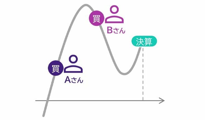 そしてこの投資信託は「決算」を迎え、分配金を払い出すとします。上図でお分かりのように、Aさんにとってその分配金は「含み益」状態での分配金であり、Bさんにとっては「含み損」状態での分配金です。