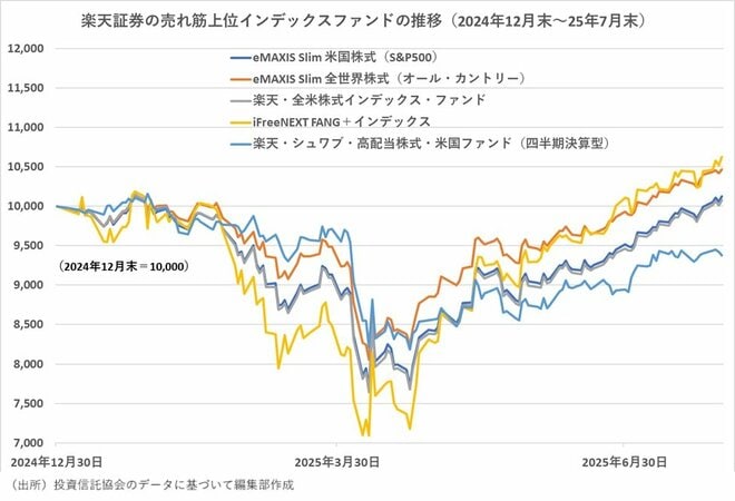 一方、7月のランキングで順位を第10位にまで落とした「楽天・シュワブ・高配当株式・米国ファンド」は、ETFを介して「ダウ・ジョーンズUSディビデンド100インデックス」に連動する運用成果をめざすファンドだが、2025年は3月までは「S&P500」や「オルカン」を上回るパフォーマンスだった。しかし、4月の急落以降の戻り相場で「S&P500」にも届かない戻り率になってしまった。この劣後したパフォーマンスが同ファンドに対する評価を低くしてしまっていると考えられる。