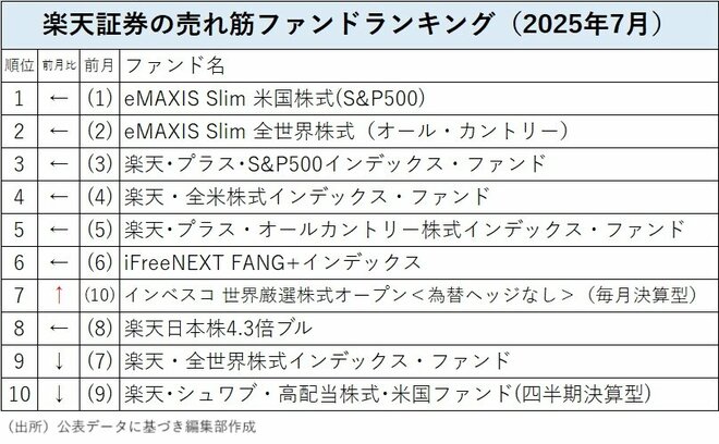 楽天証券の投信売れ筋ランキングの2025年7月のトップ6は前月と同じになった。「eMAXIS Slim 米国株式(S&P500)」をトップに、第2位以下は「eMAXIS Slim 全世界株式(オール・カントリー)」(通称:オルカン)、「楽天・プラス・S&P500インデックス・ファンド」、「楽天・全米株式インデックス・ファンド」、「楽天・プラス・オールカントリー株式インデックス・ファンド」、「iFreeNEXT FANG+インデックス」だった。前月第10位だった「インベスコ 世界厳選株式オープン<為替ヘッジなし>(毎月決算型)」(愛称:世界のベスト)が第7位に上がり、前月第7位だった「楽天・全世界株式インデックス・ファンド」は第9位に、第9位だった「楽天・シュワブ・高配当株式・米国ファンド」は第10位に下がった。