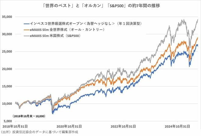 「世界のベスト」のパフォーマンスを「オルカン」と比較できる2018年10月末から2025年7月末まで約7年間を振り返ってみると、2020年3月の「コロナ・ショック」で世界の株価が大きく下落した後で、「世界のベスト」は「オルカン」に大きく出遅れたことになった。ところが、2023年3月頃から徐々に「世界のベスト」は「オルカン」との差を詰め始める。株式市場は、2024年8月や2025年4月のような急落がある。「世界のベスト」は株式市場の急落のたびにインデックスよりも下落率を抑えることによって少しずつパフォーマンスの差を小さくしてきている。そして、2024年12月末を起点として2025年のパフォーマンスを見ると年初から「世界のベスト」が「オルカン」を上回る成績になっている。
