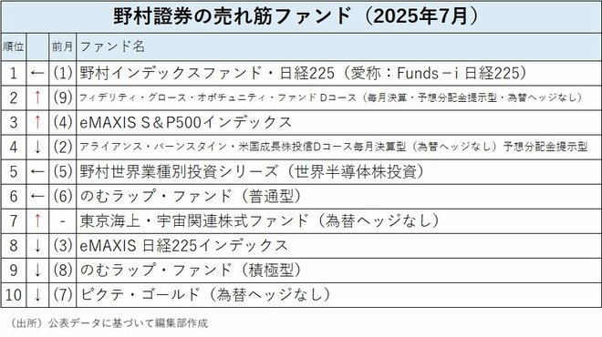 野村證券の投信売れ筋ランキングの2025年7月は、前月に続いて「野村インデックスファンド・日経225(愛称:Funds-i日経225)」がトップだった。第2位には前月第9位だった「フィデリティ・グロース・オポチュニティ・ファンドDコース(毎月決算・予想分配金提示型・為替ヘッジなし)」がジャンプアップした。また、第3位に「eMAXIS S&P500インデックス」が上がり、トップ10圏外から第7位に「東京海上・宇宙関連株式ファンド(為替ヘッジなし)」がランクインするなど、米国のハイテク株に関して再び強気の見方が強まったようだ。一方、前月は第3位だった「eMAXIS 日経225インデックス」が第8位に落ちた。前月第7位だった「ピクテ・ゴールド(為替ヘッジなし)」も第10位に後退するなど、米国株以外の資産に関してはやや評価が下がった印象だ。