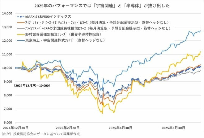 また、前月から第5位の順位をキープしている「野村世界業種別投資シリーズ(世界半導体株投資)」は、半導体関連株に特化したポートフォリオで運用しているファンドだ。そして、トップ10にランクインした「東京海上・宇宙関連株式ファンド(為替ヘッジなし)」も衛星やロケット等の宇宙開発関連のテクノロジー企業に投資するファンドになっている。7月の売れ筋ランキングで評価を高めたファンドは、いずれもテクノロジー企業にフォーカスしたファンドといえる。2025年の運用成績を振り返ると、「東京海上・宇宙関連株式ファンド(為替ヘッジなし)」が年初から他のファンドを圧倒するパフォーマンスを示している。また、「野村世界業種別投資シリーズ(世界半導体株投資)」は4月の急落時に、他のファンドよりも大きな下落率となったが、その後の切り返しでいち早く年初来の高値を更新し、「S&P500」インデックスファンドを上回る成績になっている。このパフォーマンスの良さが改めて注目されるきっかけになっているのだろう。