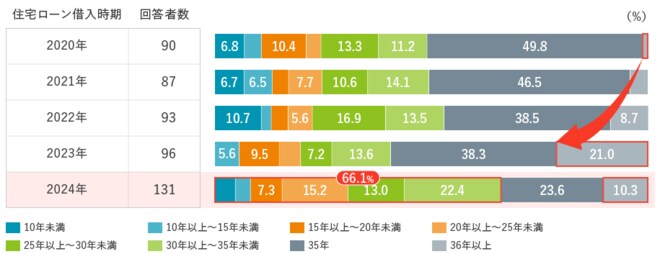 しかし2024年は、借入期間35年が減少(23.6%)し、「借入期間20年以上~25年未満」「借入期間30年以上~35年未満」が増加していました(図表4)。