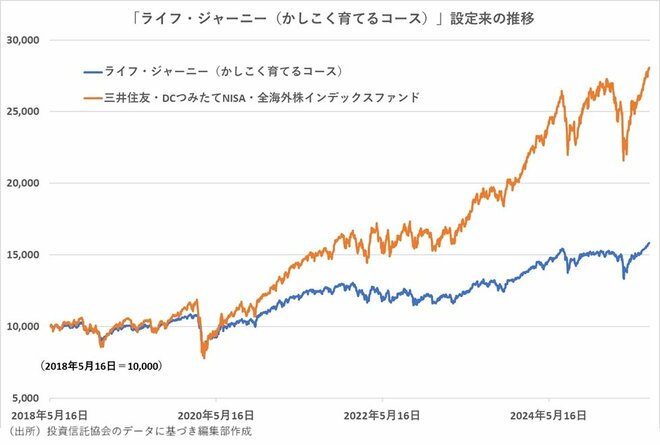 「ライフ・ジャーニー(かしこく育てるコース)」の2025年7月末時点のトータルリターンは1年で6.62%、3年で28.56%(年率8.73%)、5年で56.01%(年率9.30%)となっている。同ファンドが意識している短期金利「TONA複利(30日)」が7月末時点で0.477%程度であることを考えれば、「短期金利+年3%」を十分にクリアする成績を残している。この水準を全世界株式インデックス「三井住友・DCつみたてNISA・全海外株インデックスファンド」の1年トータルリターン15.97%、3年で72.31%(年率19.89%)、5年で162.34%(年率21.28%)などと比較すると見劣りしてしまうが、株式は時に急落するという性質があることを考えれば、比較的安定的にリターンを積み上げていく同ファンドも魅力があると感じられる。