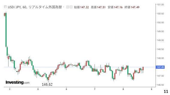 ここでドル円相場も見ておきましょう。ドル円は雇用統計後に大幅に下落した後、週明け146円62銭まで下落する場面が見られました。但し、ドルも円も弱かったことからその後は総じて横ばい圏で推移しています(11ページ)。