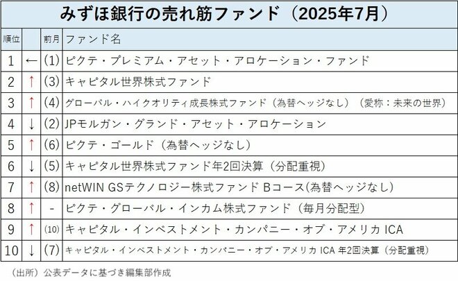 みずほ銀行の投信売れ筋ランキングの2025年7月のトップは2024年11月から9カ月連続で「ピクテ・プレミアム・アセット・アロケーション・ファンド」だった。そして、前月は第3位に後退していた「キャピタル世界株式ファンド」は第2位に浮上した。前月第4位の「グローバル・ハイクオリティ成長株式ファンド(為替ヘッジなし)(愛称:未来の世界)」が第3位に上がった。第5位には「ピクテ・ゴールド(為替ヘッジなし)」が第6位から浮上した。一方、第7位に「netWIN GSテクノロジー株式ファンドBコース(為替ヘッジなし)」、第9位に「キャピタル・インベストメント・カンパニー・オブ・アメリカICA」が上がるなど、米国テクノロジー株人気が復調している。また、トップ10圏外から「ピクテ・グローバル・インカム株式ファンド(毎月分配型)」が第8位にランクインした。