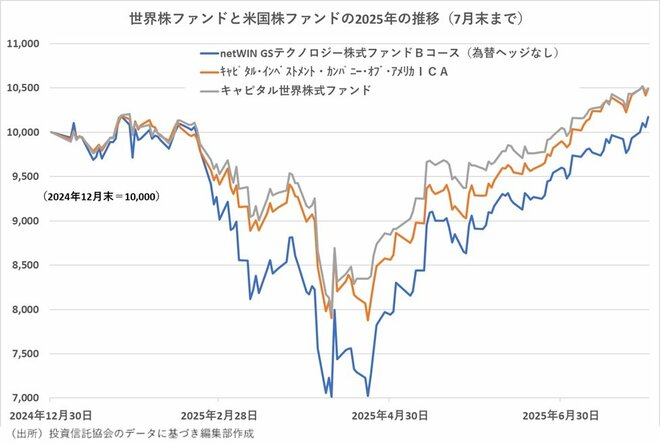 実際に2025年1月からのファンドパフォーマンスを振り返ると、世界の株式から厳選投資する「キャピタル世界株式ファンド」が一貫して米国株ファンドより優位なパフォーマンスだった。特に、4月の下落局面では下落率が抑えられ、その後の回復局面でも先行する動きだったが、6月以降に米国株ファンドが急速に出遅れを取り戻している。「netWIN GSテクノロジー株式ファンドBコース(為替ヘッジなし)」は4月の下落率が大きかったために、「キャピタル世界株式ファンド」との格差が一時は大きくなっていたが、その差を詰めてきている。