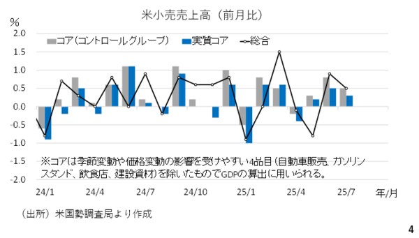 また、アメリカの小売売上高は前月比+0.5%と6月から伸びが鈍化しています。ただし6月分は0.6%から0.9%へ上方修正されており、その前月から0.5%の伸びを記録しており、決して弱くありません。また、変動の激しい図中記載の4品目を除いたコア、物価の変動を除いた実質とも4月や5月に比べれば、個人消費の底堅さを示しています。やはり、現状では9月に50bpの利下げを必要とするほど消費が悪いわけではないようです。