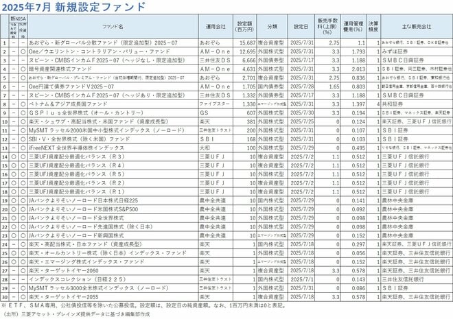 三菱アセット・ブレインズがまとめた2025年7月の公募投信(ETF、DC専用、SMA専用、公社債投信除く)の新規設定ファンド数は30本と前月(26本)から増加したものの、設定総額は約480億円と前月(約1900億円)から大きく減少した。新規設定額ランキング(設定額は設定日の純資産額)でトップは、あおぞら投信の単位型ファンドである「あおぞら・新グローバル分散ファンド(限定追加型)2025-07」の約157億円だった。第5位に姉妹シリーズの「あおぞら・新グローバル・プレミアム・ファンド(当初漸増期間付、限定追加型)2025-07」(約27億円)もランクインした。第3位に「ヌビーン・CMBSインカムF2025-07(ヘッジなし・限定追加型)」(約67億円)、第7位に「ヌビーン・CMBSインカムF2025-07(ヘッジあり・限定追加型)」(約13億円)、第6位に「One円建て債券ファンドⅤ2025-07」が入るなど、前月同様に新規設定額上位に単位型ファンドが目立っている。