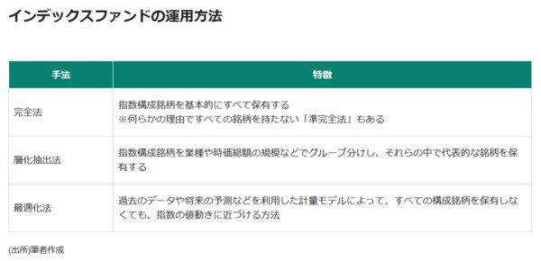 指数を構成するすべての銘柄を保有する運用方法を「完全法」と呼ぶ。この手法は指数との連動が保ちやすいメリットがあるものの、構成銘柄数が多くなると、売買コストがかさんでくるうえ、流動性が低い銘柄を保有しないといけないなど、実務的に煩雑になるデメリットがある。そうした場合は「層化抽出法」や「最適化法」といった、すべての銘柄を持たずに指数への連動を目指す運用方法が選ばれるケースが多い。
