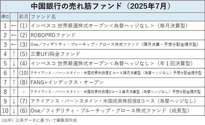 中国銀行の投信売れ筋ランキング(窓口販売件数)の2025年7月のトップ3は前月と同じ「インベスコ 世界厳選株式オープン<為替ヘッジなし>(毎月決算型)」、「ROBOPROファンド」、「One/フィデリティ・ブルーチップ・グロース株式ファンド(隔月決算・予想分配金提示型)」だった。第4位には「三菱UFJ純金ファンド」が前月の第5位から浮上し、前月第4位だった「インベスコ 世界厳選株式オープン<為替ヘッジなし>(年1回決算型)」は第5位に後退した。第6位に、「アライアンス・バーンスタイン・米国成長株投信 Eコース隔月決算型(為替ヘッジなし)予想分配金提示型」が前月の第10位からジャンプアップし、第7位には「FANG+インデックス・オープン」が上がった。