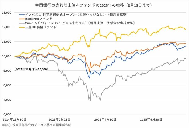 中国銀行の売れ筋上位ファンドのパフォーマンスを振り返ると、年初来で最も高い運用実績を残している「三菱UFJ純金ファンド」の基準価額の上昇率が鈍化しているほか、4月の株価下落後の戻り相場で基準価額(分配金込み)の上昇に勢いがあった「インベスコ 世界厳選株式オープン<為替ヘッジなし>(毎月決算型)」の動きも鈍ってきていることがわかる。結果的に多資産に分散投資する「ROBOPROファンド」が8月15日時点で年初来のパフォーマンスが第2位に上がっている。