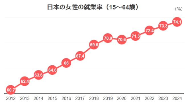 ※1 内閣府男女共同参画局(OECD STATより)作成、資料「女性活躍に関する基礎データ」P2より「15~64歳の女性の就労率2020年は70.6%。これはOECD38か国中13位」ちなみに2024年は74.1%の水準へ一段と上昇しているため、より上位の水準になっていることが推測される