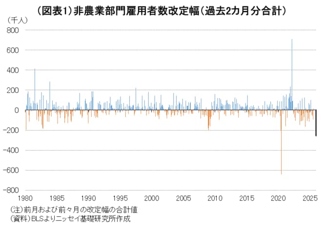 特に、過去2カ月分の修正幅は、コロナ禍の2020年5月(▲64.2万人)以来の大きさで、市場に衝撃を与えた(図表1)。こうした大幅修正は金融危機やパンデミックなど景気の転換点にみられており、足元の労働市場に変調が生じている可能性を示唆する。