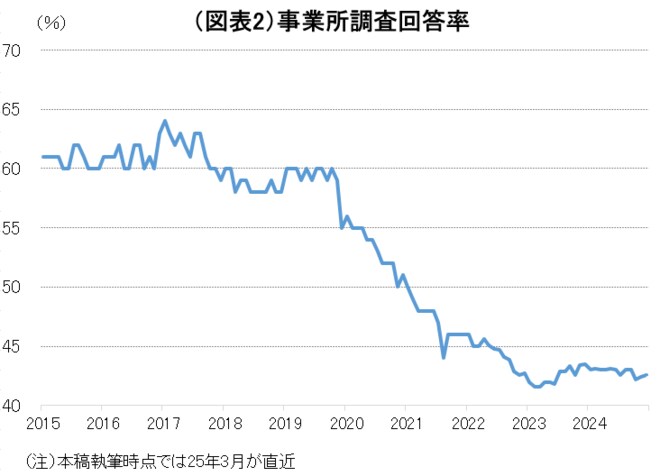 今回の修正幅拡大の要因として、①季節調整の影響、②事業所調査(CES)の回答率低下が指摘されている。例えば、6月の州・地方政府教育部門は当初6.3万人増と発表されたが、7月統計では0.8万人増と、差し引き▲5.6万人の修正となった。これは夏休みに伴う季節的変動の影響とみられる。また、雇用者数推計に使われるCESの回答率はコロナ禍前の約6割からコロナ禍で4割台に落ち込み、直近2025年3月でも43%にとどまる(図表2)。回答率が低いと速報値の不確実性が高まり、後日の大幅修正につながる。