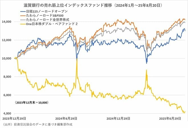滋賀銀行の売れ筋で第3位に上がった「One日本株ダブル・ベアファンド2」は、日々の国内株式市場の値動きに対しておおむね2倍程度反対になることをめざして運用するファンドで、日本株が下落するという見方をする投資家が購入する。6月にトップ10圏外から第4位にジャンプアップし、7月に順位を一段上げた。同ファンドの値動きが際立ったのは4月の株価下落時だった。3月末から4月7日まで1週間で基準価額は約30%上昇した。その後、株価が戻るとともに、同ファンドの基準価額は下落し始めた。