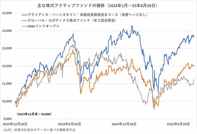 売れ筋トップ10にランクインしている株式アクティブファンドは、これまでの主力であった「アライアンス・バーンスタイン・米国成長株投信Bコース(為替ヘッジなし)」を除けば、第6位にある「グローバル・ロボティクス株式ファンド(年2回決算型)」、第7位になった「HSBCインドオープン」など、パフォーマンスの面ではまだ成果が表れていない銘柄といえる。将来の成長に期待して株価が上がってしまう前に投資を始めておきたいという動きだろうか。
