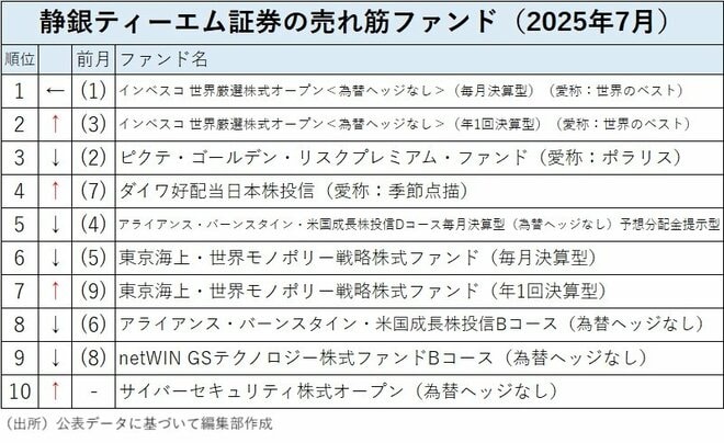 静銀ティーエム証券の投信売れ筋(販売額)ランキングの2025年7月のトップは「インベスコ 世界厳選株式オープン<為替ヘッジなし>(毎月決算型)」、第2位は「インベスコ 世界厳選株式オープン<為替ヘッジなし>(年1回決算型)」だった。第3位に「ピクテ・ゴールデン・リスクプレミアム・ファンド(愛称:ポラリス)」が入り、前月第4位だった「アライアンス・バーンスタイン・米国成長株投信Dコース毎月決算型(為替ヘッジなし)予想分配金提示型」は第5位に後退した。