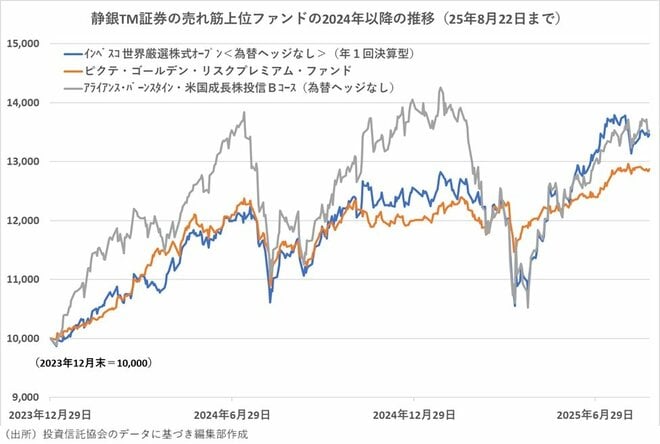 静銀ティーエム証券は、静岡銀行を核とする「しずおかフィナンシャルグループ」の証券会社だ。売れ筋トップ10に常連で入ってくる「インベスコ 世界厳選株式オープン<為替ヘッジなし>」、「ピクテ・ゴールデン・リスクプレミアム・ファンド(愛称:ポラリス)」、「アライアンス・バーンスタイン・米国成長株投信」は、他の販売会社でも人気のファンドで純資産残高が急速に拡大している。ただ、各ファンドの基準価額(分配金込み)の推移を振り返ると、三者三様で値動きに特徴があることがわかる。