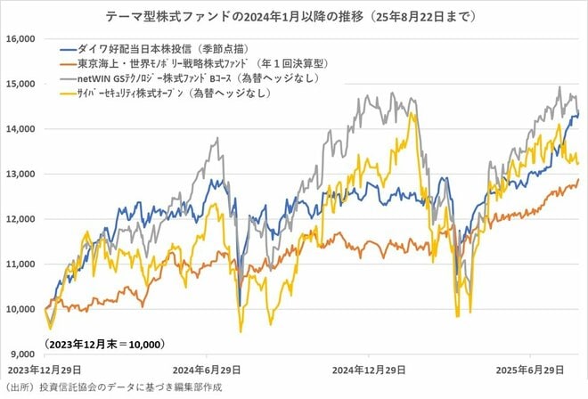 「サイバーセキュリティ株式オープン(為替ヘッジなし)」は日本を含む世界の株式市場からサイバーセキュリティに関連する優れたテクノロジー企業に投資するファンドだ。米国のテクノロジー企業への投資が中心となり、また、関連企業の株価の値動きが比較的大きいことから、ファンドの基準価額も大きく動く傾向がある。4月の株安局面で大きく売られたものの、その後の回復も大きかったが、8月に入って基準価額の上昇に一服感がある。AIの発展によって、IOT(モノのインターネット)などデジタルネットワークが一段と拡大する方向にあり、そのネットワークの拡張にともなってサイバーセキュリティの重要性はますます高まる方向にある。将来の成長が大いに期待できる分野といえ、今後のファンドの成長も期待されるところだ。