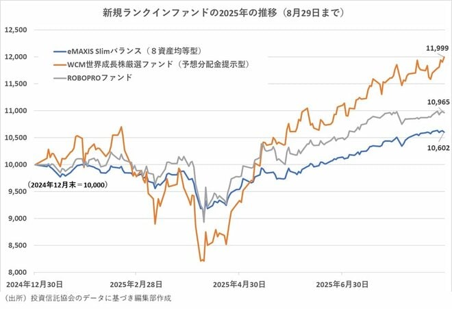 第10位にランクインした「ROBOPROファンド」は6月最終週には売れ筋ランキングの第7位に入っていた。世界の取引所に上場しているETF(上場投資信託)に投資することによって実質的に世界の株式、債券、リート(不動産投信)、コモディティ等に分散投資する。投資配分比率は過去のマーケットデータから割り出された最適な配分比率として毎月大胆に変えている。2025年の運用成績は株式市場の大きな変動の影響を抑えて安定的に推移し、8月末時点の年初来上昇率は9.65%と「eMAXIS Slim バランス(8資産均等型)」を上回っている。