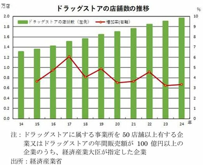 神様:店舗数で見ると、ドラッグストアは4年間で2割以上増え、店舗数の最高記録数を更新し続けています。しかし、増加率は鈍化傾向にあります。大手チェーンで積極的な企業の統合などが行われている一方で、中小チェーン店の苦戦が伺えます。